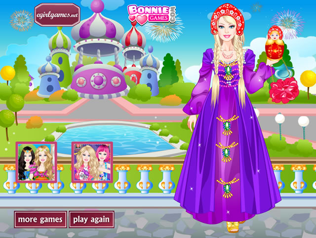 Barbie est partie en Russie et on lui a proposé de s'habiller de façon traditionnelle pour prendre des photos. La jeune femme a accepté, et elle se demande à présent quelle tenue elle va choisir. Elle a beaucoup de choix : il y a des robes de toutes les couleurs (violet, rouge, vert, bleu, ...) et des habits de toutes sortes. Barbie va sans doute devoir toutes les essayer pour choisir. Vous êtes là pour l'aider, la coiffer et la conseiller. Elle a aussi beaucoup de possibilités en ce qui concerne la coiffure, les chaussures et les accessoires. Quand vous aurez fini de créer votre tenue, vous pourrez la contempler. C'est beau, vous ne trouvez pas ? Ce jeu se joue avec la souris.