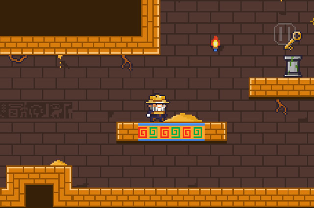 Vous avez parcouru le monde entier, à la recherche de trésors inestimables, et vous avez finir par en localiser un, dans une pyramide égyptienne. En vous en approchant, le sol s'est écroulé et vous avez été piégé. Il va falloir trouver la sortie de cet endroit, ainsi que le trésor qu'il renferme. Dans chaque niveau, vous devrez sauter d'une plateforme à l'autre, collecter la clef d'or, ouvrir la porte et sortir. Il faudra également éviter les nombreux pièges mortels qui ont été disposés le long de votre parcours. Bonne chance à tous ! Utilisez les flèches du clavier pour jouer à ce jeu.