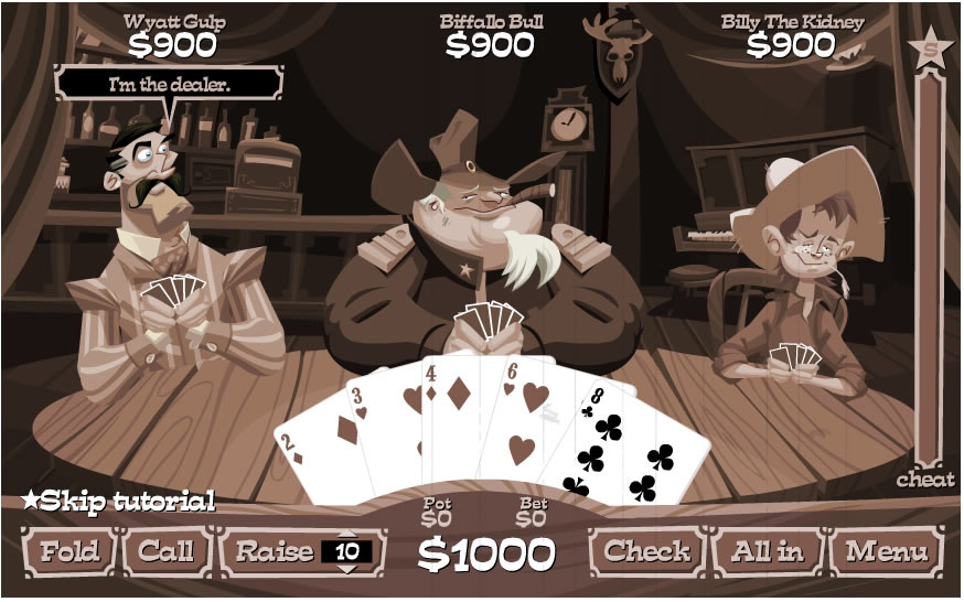 Rejoignez une table et préparez-vous à affronter les plus grands joueurs de cartes de l'ouest. Chaque personnage possède des attributs (comme l'agressivité du style de jeu ou la possibilité de tricher) et des capacités (comme celle de jeter un coup d'oeil sur les cartes de ses adversaires). Ce jeu se joue à l'aide de la souris. Vous pouvez utiliser la capacité spéciale de votre personnage pour tricher dans le jeu, mais seulement lorsque la barre de confiance est chargée au maximum. La barre se charge de 10% à chaque main et de 35% quand vous emportez une main. Utilisez votre capacité prudemment, parfois les adversaires remarquent quelque chose de louche !