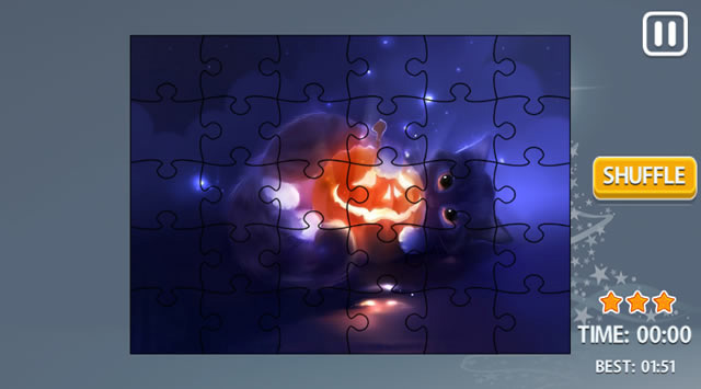 Jigsaw Puzzle Halloweeny est un jeu composé de 16 puzzles spécialement choisis pour Halloween. Un chaton tenant une citrouille, un épouvantail à vous glacer le sang, un trio de citrouilles enjouées, et bien d'autres encore vous attendent. Sélectionnez sans attendre votre motif préféré. Ensuite, vous pourrez choisir le nombre de pièces qui le composeront. Il faudra vous appliquer pour recomposer le puzzle entièrement. Lorsque vous aurez terminé, vous pourrez passer à une autre illustration si le cœur vous en dit ! Utilisez la souris pour jouer à ce jeu.