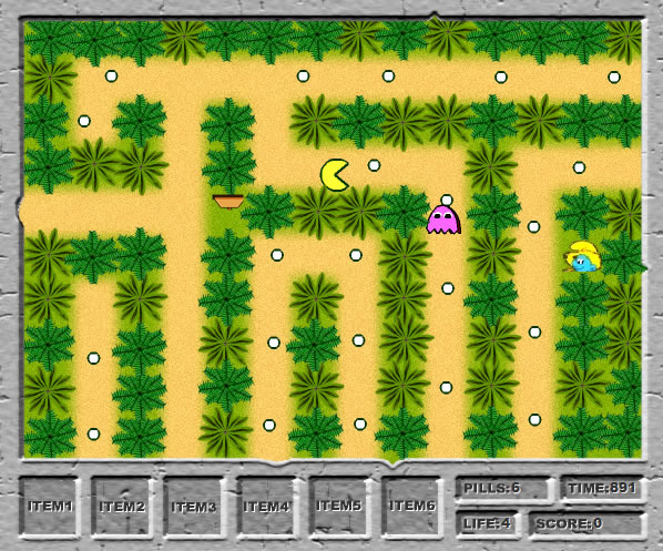 Saviez-vous que même Pacman n'était pas infaillible ? Et oui, même lui est tombé en panne, et pas n'importe où : en pleine jungle ! Aidez-le à repartir tout en prenant garde aux fantômes qui ne lui veulent pas que du bien... Jouez à l'aide des touches fléchées.