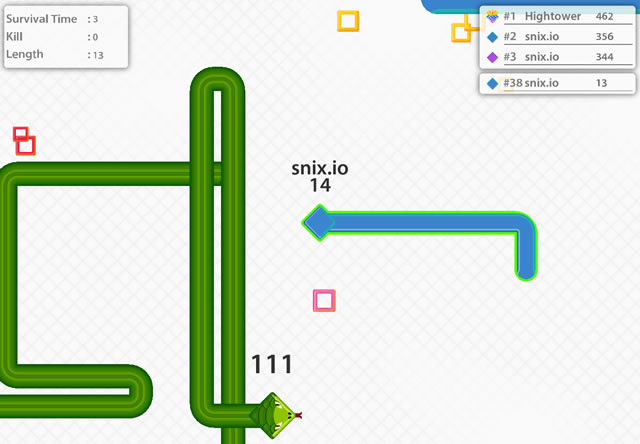 Snix.io est un nouveau jeu multijoueurs en ligne dans lequel vous allez contrôler un serpent géant absolument affamé. Votre but sera d'accroître sa longueur au maximum pour piéger les autres concurrents. Il faudra en effet faire en sorte que vos concurrents finissent par vous foncer dedans à un moment ou à un autre. Plus votre serpent sera long et plus vous aurez de chances de les piéger. Par contre, si c'est vous qui heurtez un autre serpent, vous perdrez immédiatement la partie. Combien de points serez-vous capable d'amasser ? Arriverez-vous en pôle position ? Utilisez les flèches du clavier pour jouer à ce jeu.