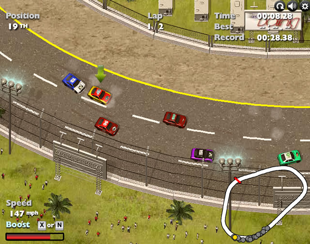 Vous êtes un grand champion mais personne ne le sait pour l'instant ? Rassurez-vous, nous allons vous donner les moyens de faire vos preuves en conduisant une voiture sur 8 circuits dans Thunder Cars. Soyez le meilleur pilote et finissez en tête de chaque course pour marquer un maximum de points et remporter suffisamment d'argent pour améliorer votre voiture. Vous allez voir qu'il est possible de la changer en allant au garage, mais on ne vous fera pas crédit. Utilisez les boosts pour vous propulser et doubler les autres. Bonne chance ! Utilisez les touches fléchées pour vous déplacer et X ou N pour booster.