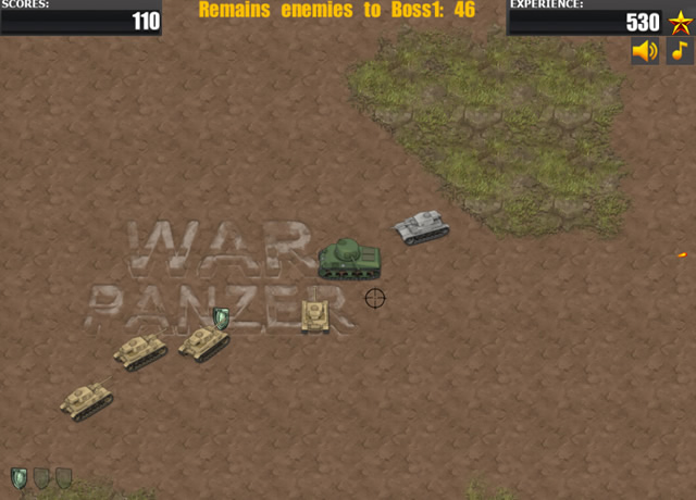 War Panzer est un nouveau jeu de guerre dans lequel vous allez devoir conduire un tank et tirer sur vos ennemis pour tous les éliminer. Il faudra en parallèle que vous vous défendiez et que vous collectiez des boucliers. Plus vous resterez en jeu longtemps et plus vous obtiendrez des étoiles. Celles-ci vous serviront en cas d'échec, au cas où vous souhaiteriez améliorer votre tank. Dépensez-les pour que vos missiles causent plus de dommages, ou encore pour être mieux protégé face à l'ennemi. Bonne chance ! Utilisez les touches fléchées pour vous déplacer et la souris pour viser et tirer.